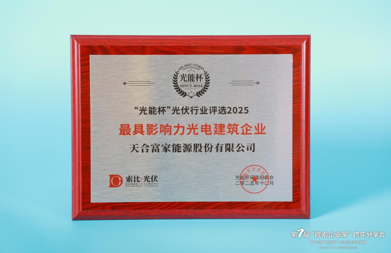 本届“光能杯”共有300余家光伏企业参与报名评选,角逐年度荣誉。此次颁奖盛典中,天合富家能源股份有限公司凭借强大创新力、出色的品质与服务、卓越的品牌影响力,荣膺2025年度最具影响力光电建筑企业。