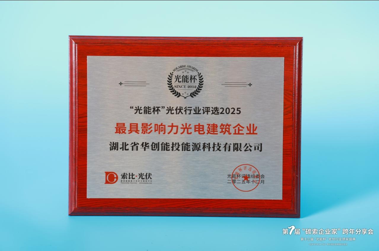 本届“光能杯”共有300余家光伏企业参与报名评选,角逐年度荣誉。此次颁奖盛典中,湖北省华创能投能源科技有限公司凭借强大创新力、出色的品质与服务、卓越的品牌影响力,荣膺2025年度最具影响力光电建筑企业。