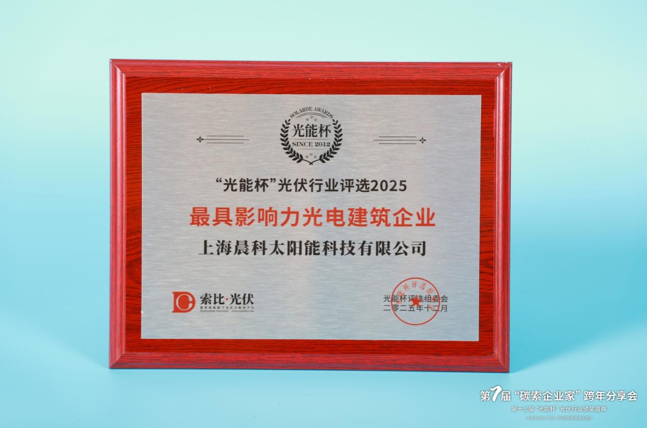 本届“光能杯”共有300余家光伏企业参与报名评选,角逐年度荣誉。此次颁奖盛典中,上海晨科太阳能科技有限公司凭借强大创新力、出色的品质与服务、卓越的品牌影响力,荣膺2025年度最具影响力光电建筑企业。