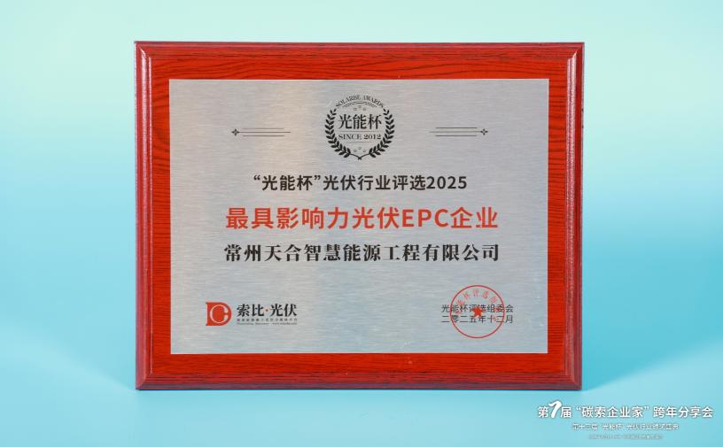 本届“光能杯”共有300余家光伏企业参与报名评选,角逐年度荣誉。此次颁奖盛典中,常州天合智慧能源工程有限公司凭借强大创新力、出色的品质与服务、卓越的品牌影响力,荣膺2025年度最具影响力光伏EPC企业。