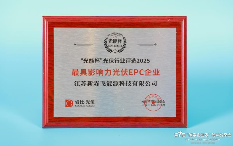 本届“光能杯”共有300余家光伏企业参与报名评选,角逐年度荣誉。此次颁奖盛典中,江苏新霖飞能源科技有限公司凭借强大创新力、出色的品质与服务、卓越的品牌影响力,荣膺2025年度最具影响力光伏EPC企业。