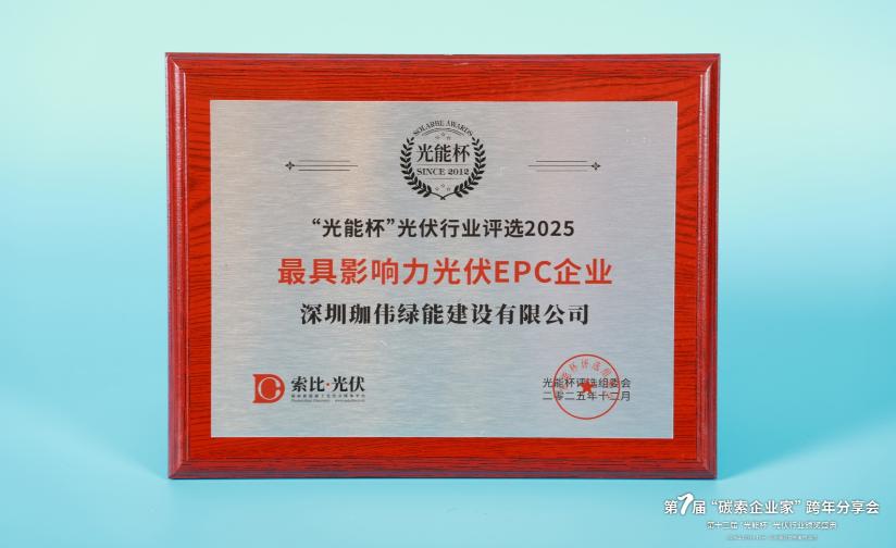 本届“光能杯”共有300余家光伏企业参与报名评选,角逐年度荣誉。此次颁奖盛典中,深圳珈伟绿能建设有限公司凭借强大创新力、出色的品质与服务、卓越的品牌影响力,荣膺2025年度最具影响力光伏EPC企业。
