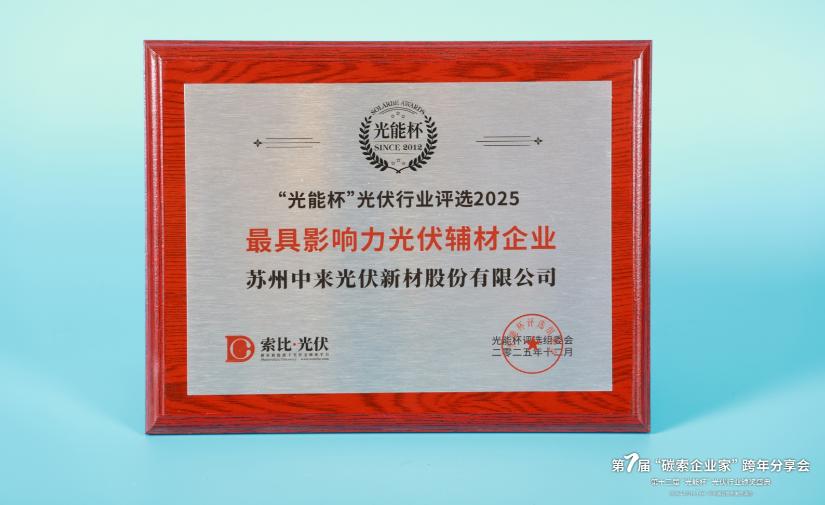 本届“光能杯”共有300余家光伏企业参与报名评选,角逐年度荣誉。此次颁奖盛典中,苏州中来光伏新材股份有限公司凭借强大创新力、出色的品质与服务、卓越的品牌影响力,荣膺2025年度最具影响力光伏辅材企业。