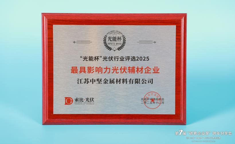 本届“光能杯”共有300余家光伏企业参与报名评选,角逐年度荣誉。此次颁奖盛典中,江苏中坚金属材料有限公司凭借强大创新力、出色的品质与服务、卓越的品牌影响力,荣膺2025年度最具影响力光伏辅材企业。