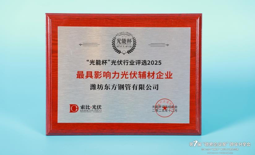 本届“光能杯”共有300余家光伏企业参与报名评选,角逐年度荣誉。此次颁奖盛典中,潍坊东方钢管有限公司凭借强大创新力、出色的品质与服务、卓越的品牌影响力,荣膺2025年度最具影响力光伏辅材企业。