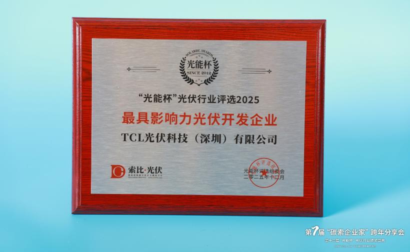 本届“光能杯”共有300余家光伏企业参与报名评选,角逐年度荣誉。此次颁奖盛典中,TCL光伏科技(深圳)有限公司凭借强大创新力、出色的品质与服务、卓越的品牌影响力,荣膺2025年度最具影响力光伏开发企业。