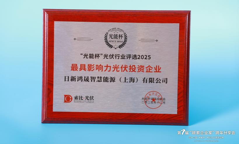 本届“光能杯”共有300余家光伏企业参与报名评选,角逐年度荣誉。此次颁奖盛典中,日新鸿晟智慧能源(上海)有限公司凭借强大创新力、出色的品质与服务、卓越的品牌影响力,荣膺2025年度最具影响力光伏投资企业。
