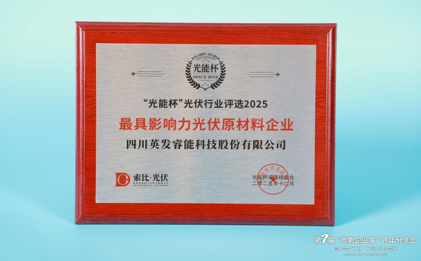 本届“光能杯”共有300余家光伏企业参与报名评选,角逐年度荣誉。此次颁奖盛典中,四川英发睿能科技股份有限公司凭借强大创新力、出色的品质与服务、卓越的品牌影响力,荣膺2025年度最具影响力光伏原材料企业。
