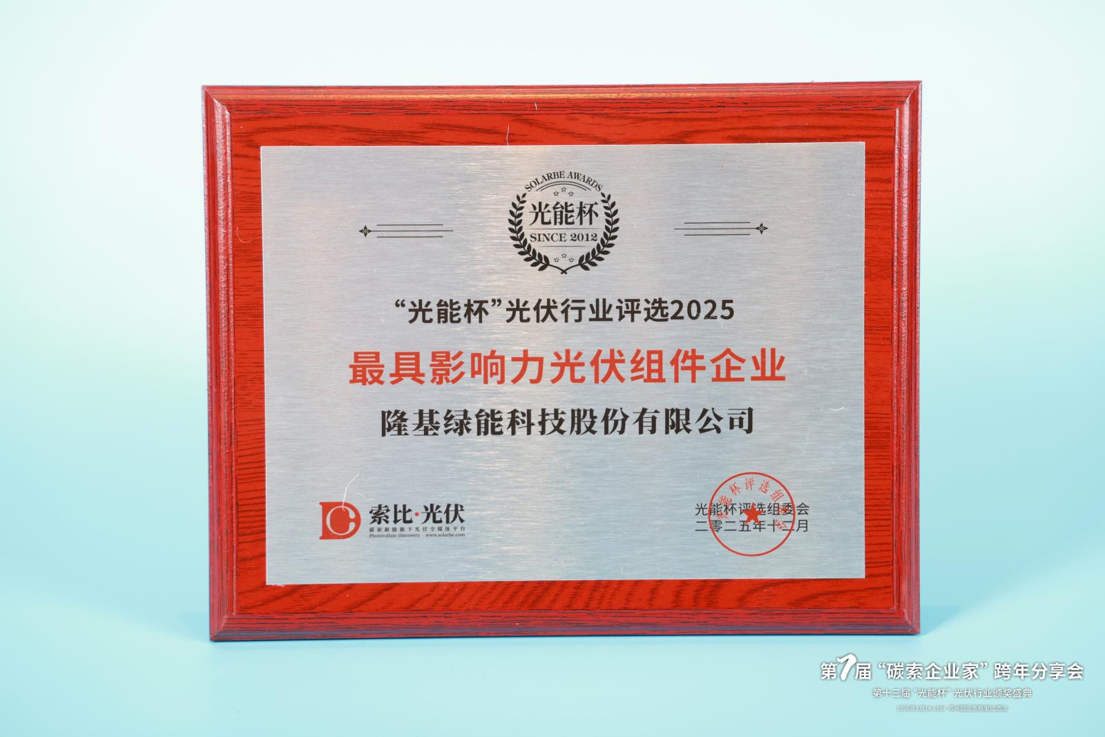 本届“光能杯”共有300余家光伏企业参与报名评选,角逐年度荣誉。此次颁奖盛典中,隆基绿能科技股份有限公司凭借强大创新力、出色的品质与服务、卓越的品牌影响力,荣膺2025年度最具影响力光伏组件企业。