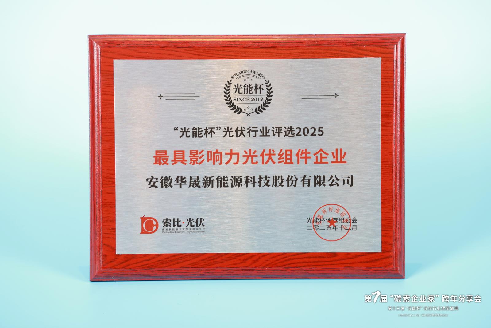 本届“光能杯”共有300余家光伏企业参与报名评选,角逐年度荣誉。此次颁奖盛典中,安徽华晟新能源科技股份有限公司凭借强大创新力、出色的品质与服务、卓越的品牌影响力,荣膺2025年度最具影响力光伏组件企业。