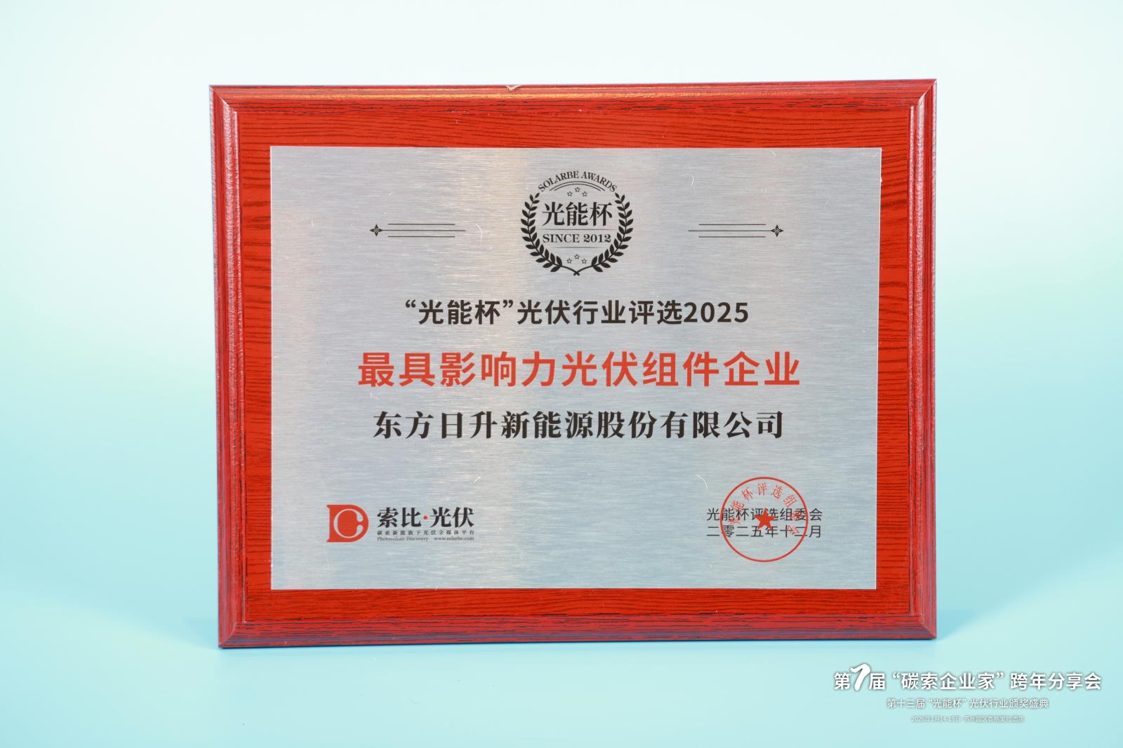 本届“光能杯”共有300余家光伏企业参与报名评选,角逐年度荣誉。此次颁奖盛典中,东方日升新能源股份有限公司凭借强大创新力、出色的品质与服务、卓越的品牌影响力,荣膺2025年度最具影响力光伏组件企业。