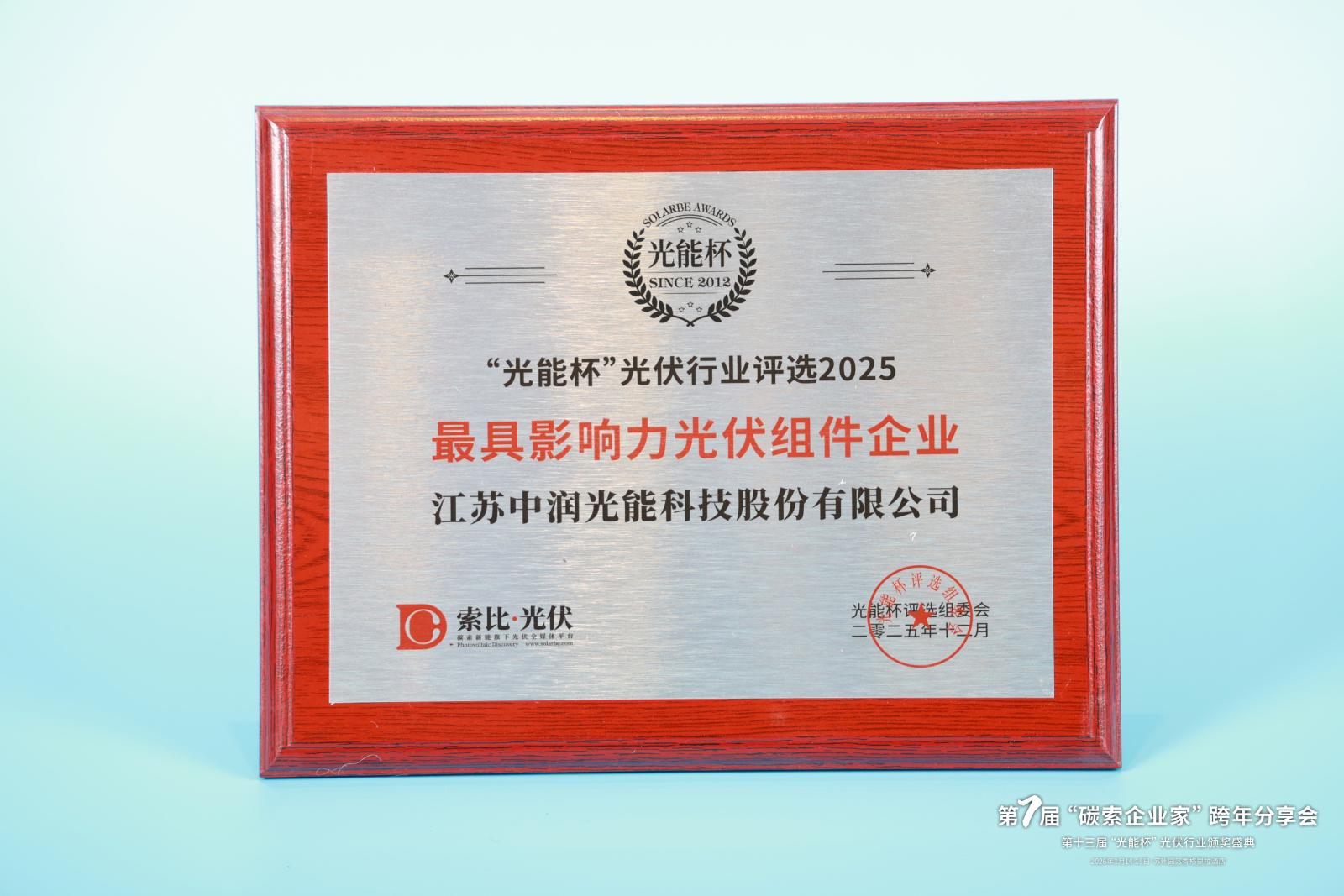 本届“光能杯”共有300余家光伏企业参与报名评选,角逐年度荣誉。此次颁奖盛典中,江苏中润光能科技股份有限公司凭借强大创新力、出色的品质与服务、卓越的品牌影响力,荣膺2025年度最具影响力光伏组件企业。