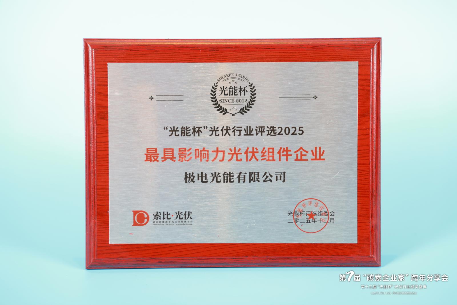 本届“光能杯”共有300余家光伏企业参与报名评选,角逐年度荣誉。此次颁奖盛典中,极电光能有限公司凭借强大创新力、出色的品质与服务、卓越的品牌影响力,荣膺2025年度最具影响力光伏组件企业。