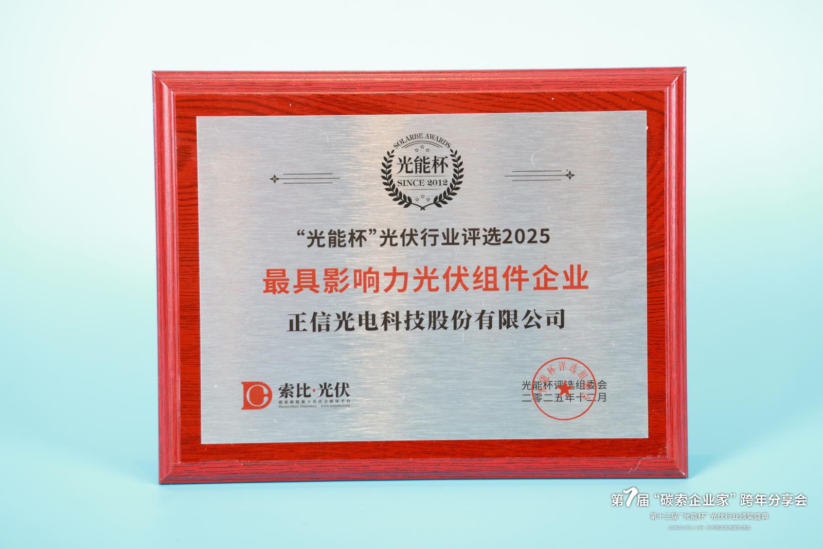 本届“光能杯”共有300余家光伏企业参与报名评选,角逐年度荣誉。此次颁奖盛典中,正信光电科技股份有限公司凭借强大创新力、出色的品质与服务、卓越的品牌影响力,荣膺2025年度最具影响力光伏组件企业。