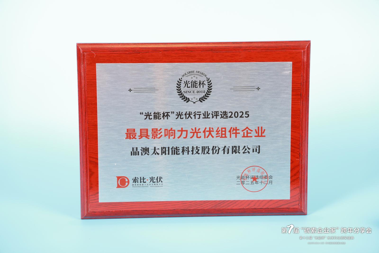 本届“光能杯”共有300余家光伏企业参与报名评选,角逐年度荣誉。此次颁奖盛典中,晶澳太阳能科技股份有限公司凭借强大创新力、出色的品质与服务、卓越的品牌影响力,荣膺2025年度最具影响力光伏组件企业。