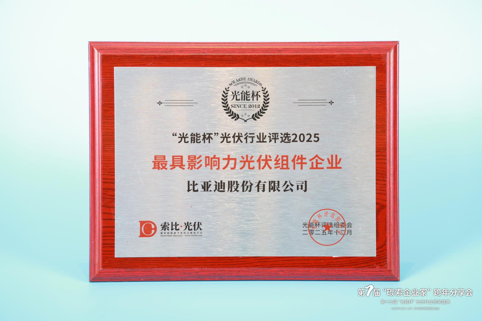 本届“光能杯”共有300余家光伏企业参与报名评选,角逐年度荣誉。此次颁奖盛典中,比亚迪股份有限公司凭借强大创新力、出色的品质与服务、卓越的品牌影响力,荣膺2025年度最具影响力光伏组件企业。