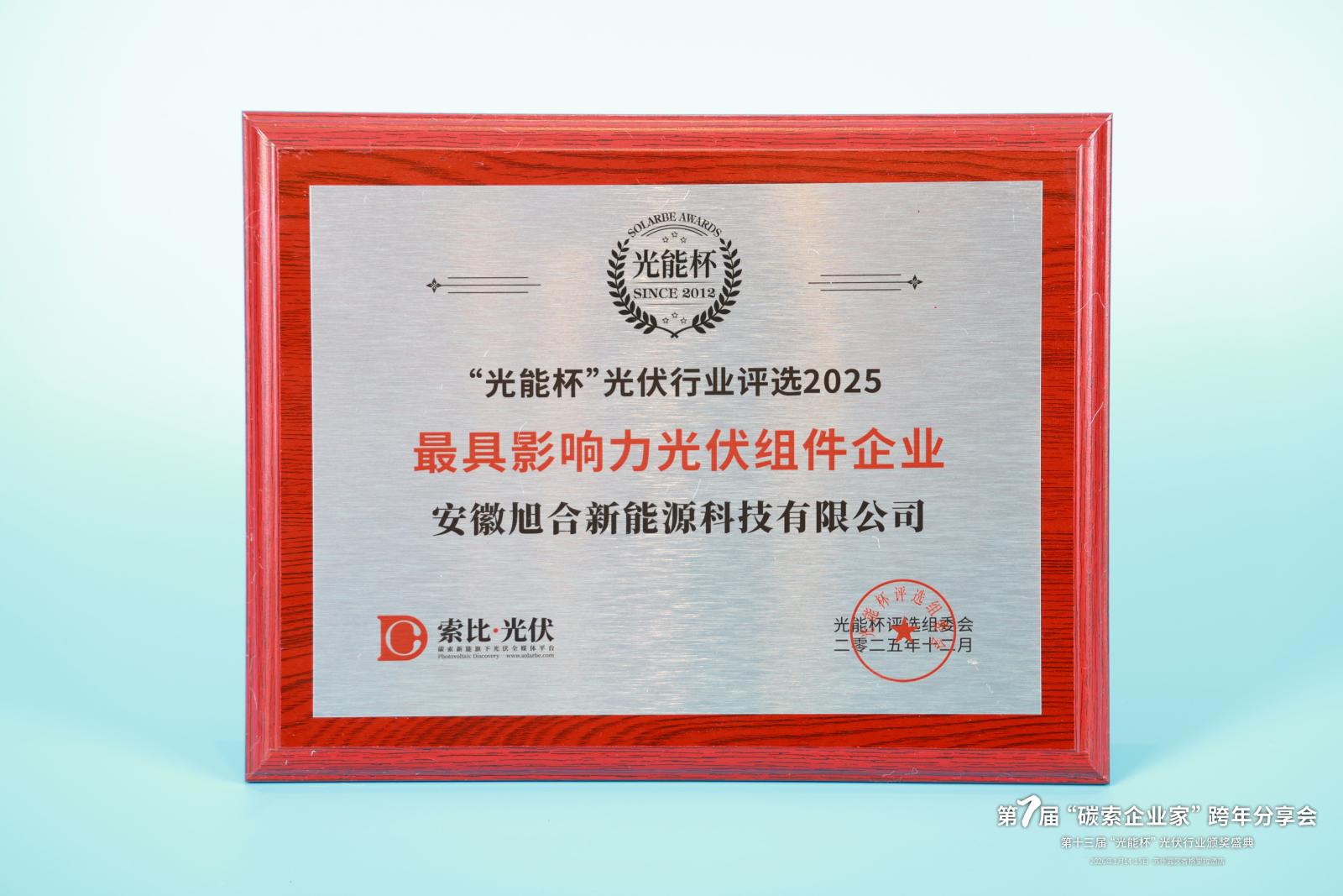本届“光能杯”共有300余家光伏企业参与报名评选,角逐年度荣誉。此次颁奖盛典中,安徽旭合新能源科技有限公司凭借强大创新力、出色的品质与服务、卓越的品牌影响力,荣膺2025年度最具影响力光伏组件企业。