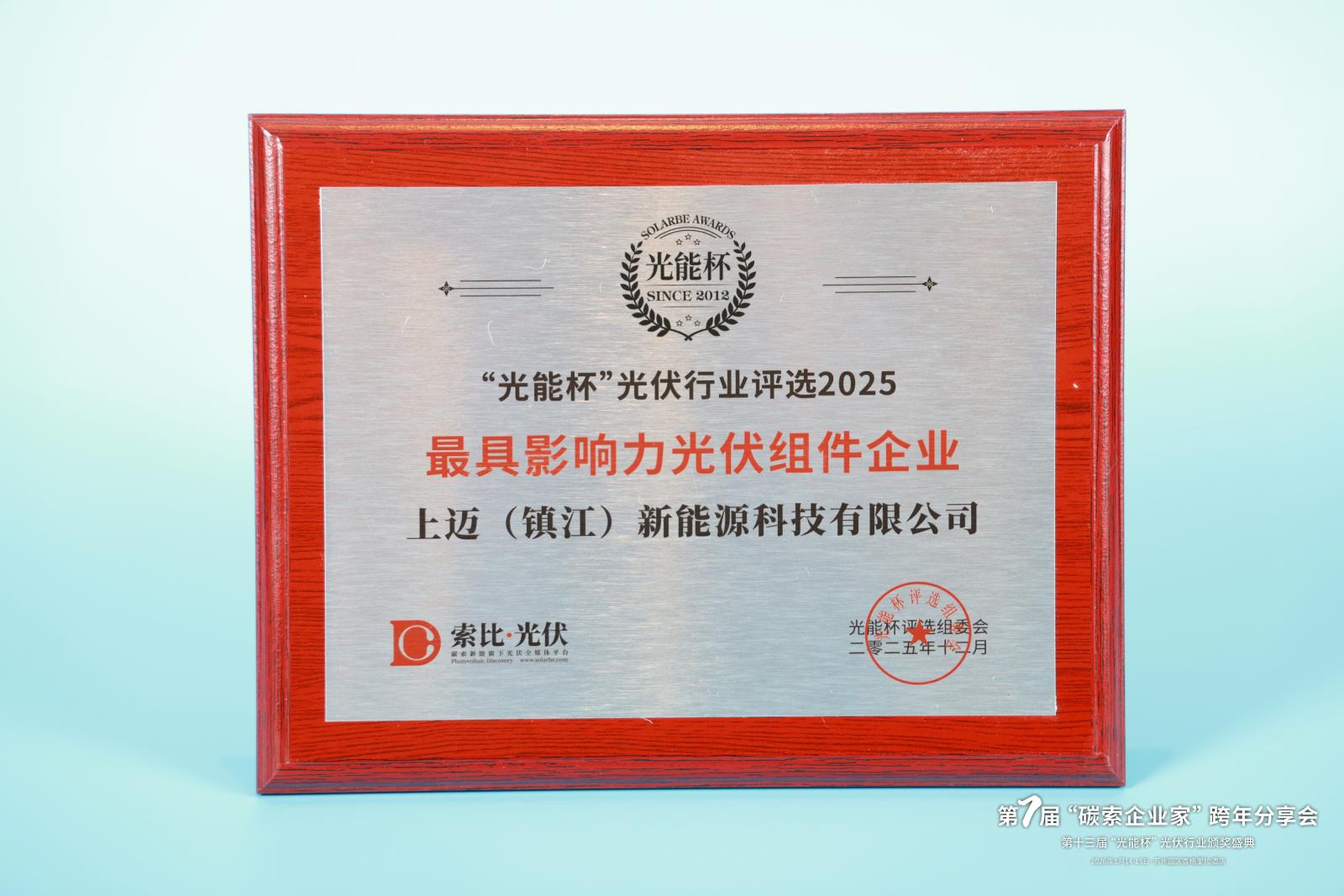 本届“光能杯”共有300余家光伏企业参与报名评选,角逐年度荣誉。此次颁奖盛典中,上迈(镇江)新能源科技有限公司凭借强大创新力、出色的品质与服务、卓越的品牌影响力,荣膺2025年度最具影响力光伏组件企业。