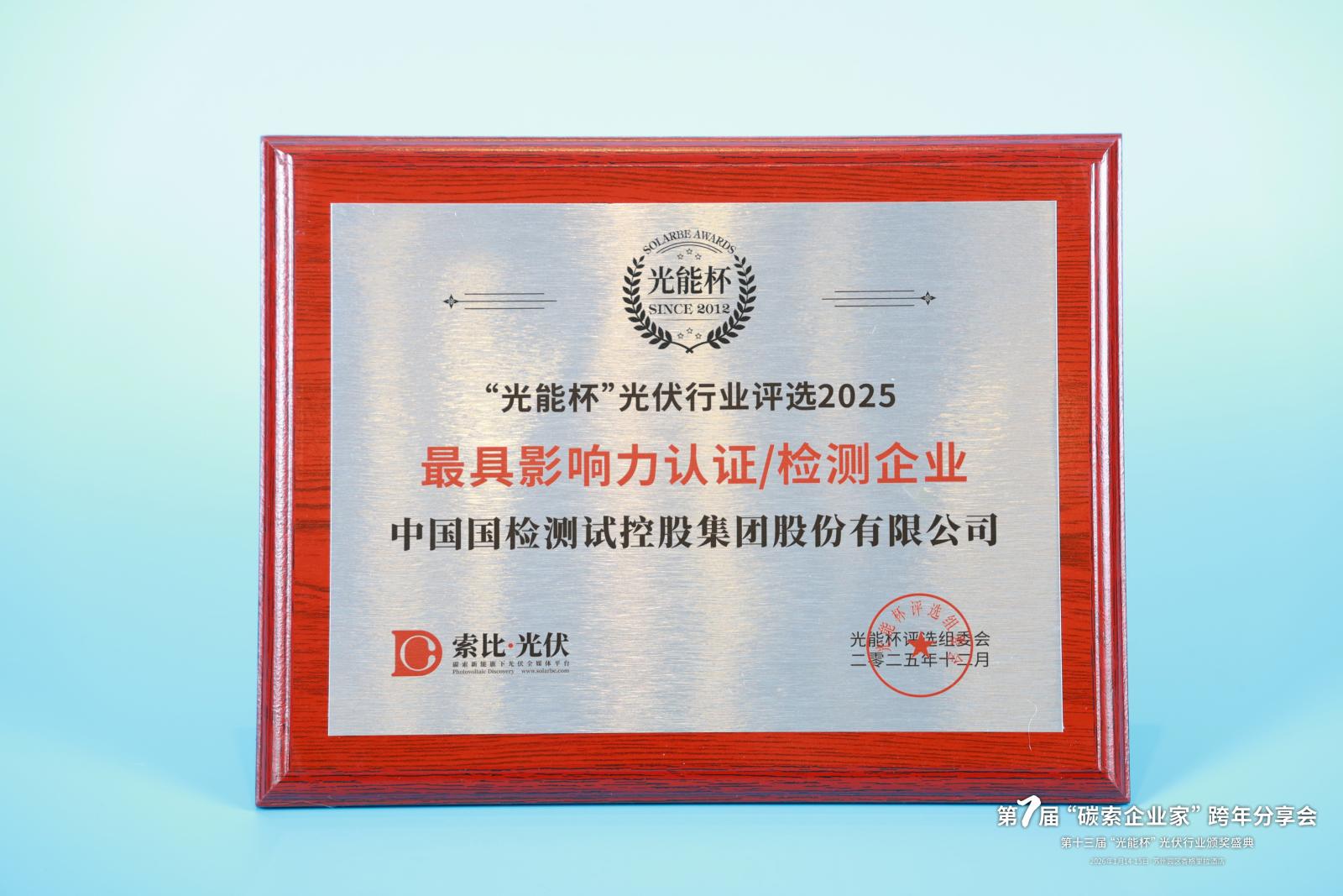 本届“光能杯”共有300余家光伏企业参与报名评选,角逐年度荣誉。此次颁奖盛典中,中国国检测试控股集团股份有限公司凭借强大创新力、出色的品质与服务、卓越的品牌影响力,荣膺2025年度最具影响力认证/检测企业。