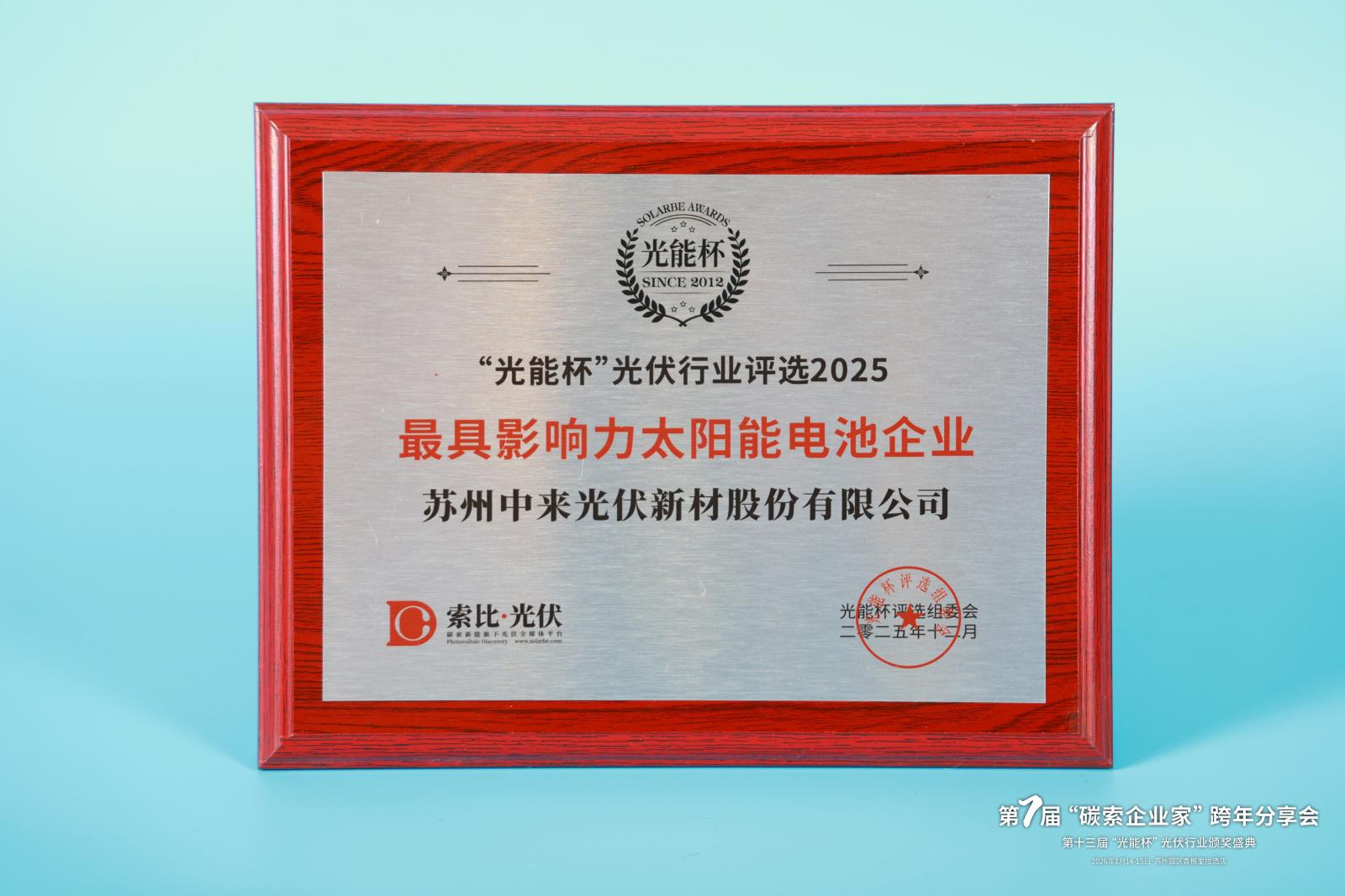 本届“光能杯”共有300余家光伏企业参与报名评选,角逐年度荣誉。此次颁奖盛典中,苏州中来光伏新材股份有限公司凭借强大创新力、出色的品质与服务、卓越的品牌影响力,荣膺2025年度最具影响力太阳能电池企业。