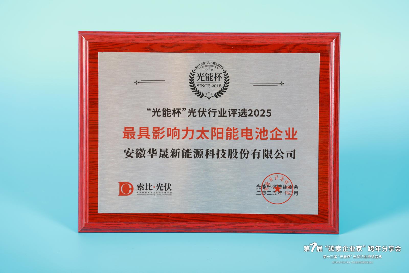 本届“光能杯”共有300余家光伏企业参与报名评选,角逐年度荣誉。此次颁奖盛典中,安徽华晟新能源科技股份有限公司凭借强大创新力、出色的品质与服务、卓越的品牌影响力,荣膺2025年度最具影响力太阳能电池企业。