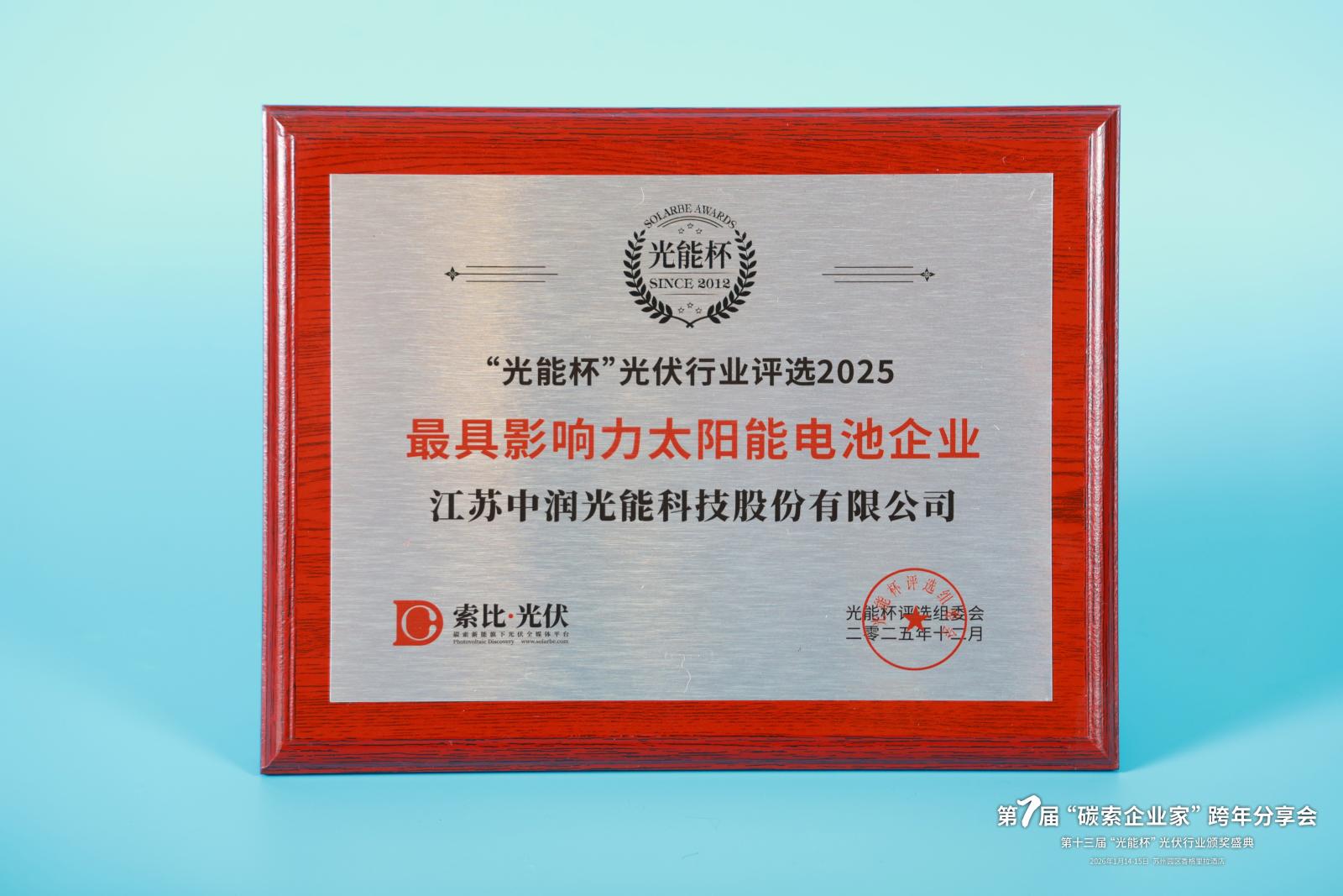 本届“光能杯”共有300余家光伏企业参与报名评选,角逐年度荣誉。此次颁奖盛典中,江苏中润光能科技股份有限公司凭借强大创新力、出色的品质与服务、卓越的品牌影响力,荣膺2025年度最具影响力太阳能电池企业。