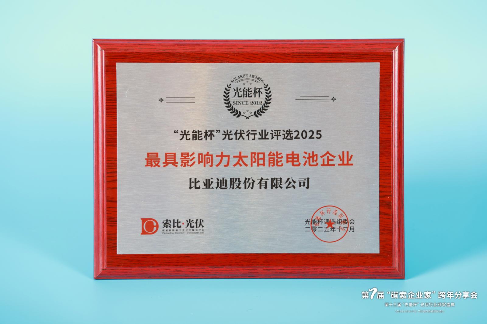 本届“光能杯”共有300余家光伏企业参与报名评选,角逐年度荣誉。此次颁奖盛典中,比亚迪股份有限公司凭借强大创新力、出色的品质与服务、卓越的品牌影响力,荣膺2025年度最具影响力太阳能电池企业。