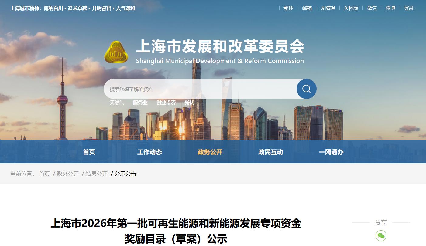 根据《上海市可再生能源和新能源发展专项资金扶持办法》(沪发改规范〔2022〕14号,以下称“14号文”),市发展改革委会同市财政局组织开展了2026年第一批可再生能源和新能源发展专项资金奖励目录的核实确认工作。