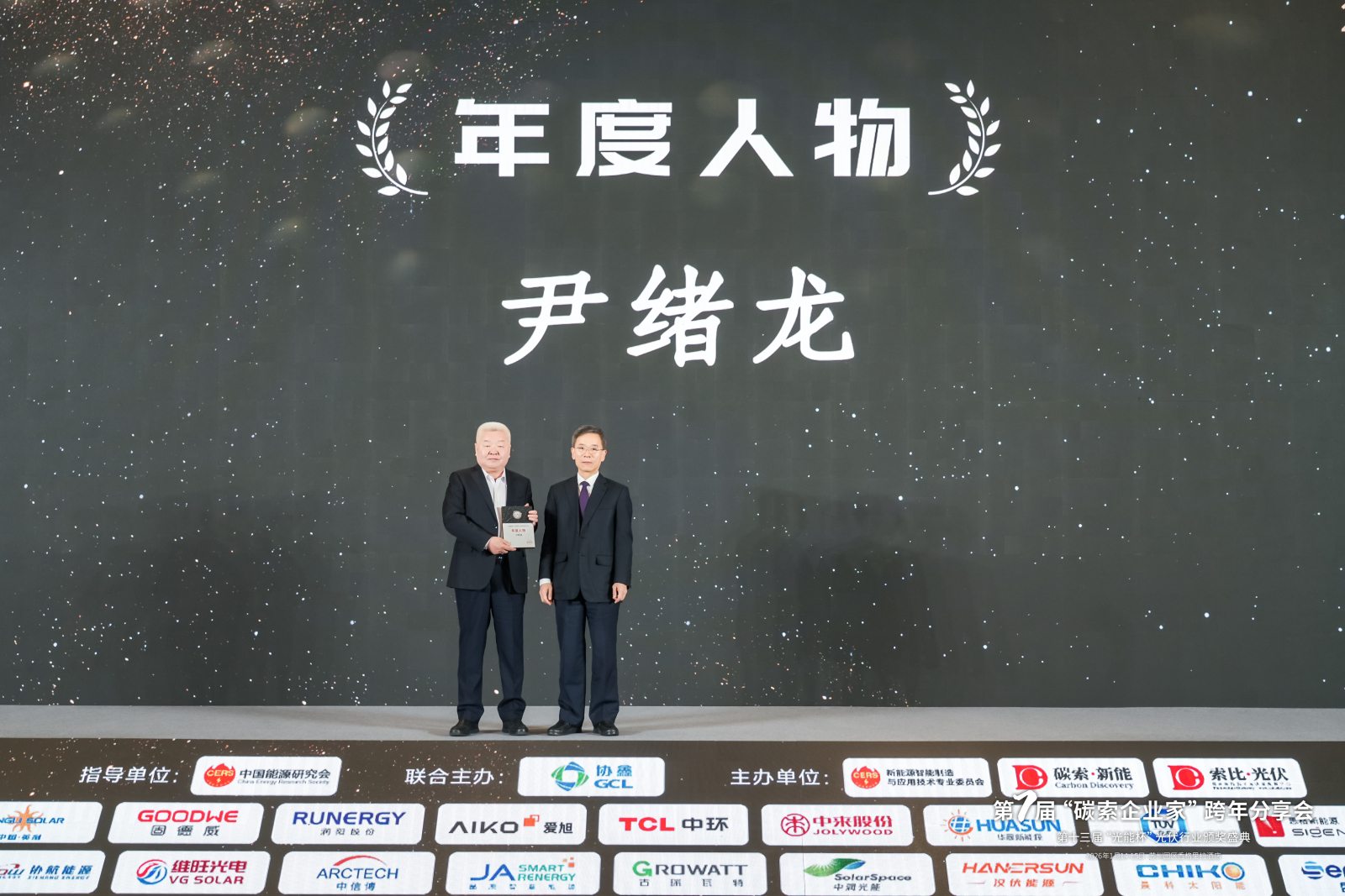 2026年1月15日,第七届"碳索企业家"跨年分享会暨2025年第十三届"光能杯"光伏行业颁奖盛典在苏州盛大举办。英利能源发展有限公司董事长尹绪龙凭借其对光伏产业的卓越贡献与持续引领,荣获年度人物大奖。