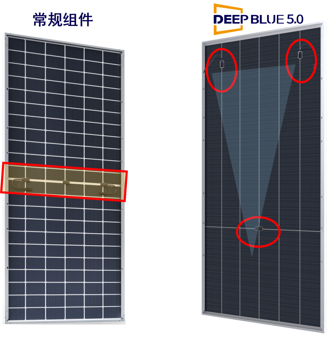 顺应新的电路设计,晶澳DeepBlue 5.0更改善了背玻孔位,通过创新采用三点分散结构,改善了传统三点集中结构的应力风险,同步强化了组件的抗载荷能力。在背玻应力对比中,采用背玻孔位“三角分散布局”的DeepBlue 5.0较常规组件均有明显优势。