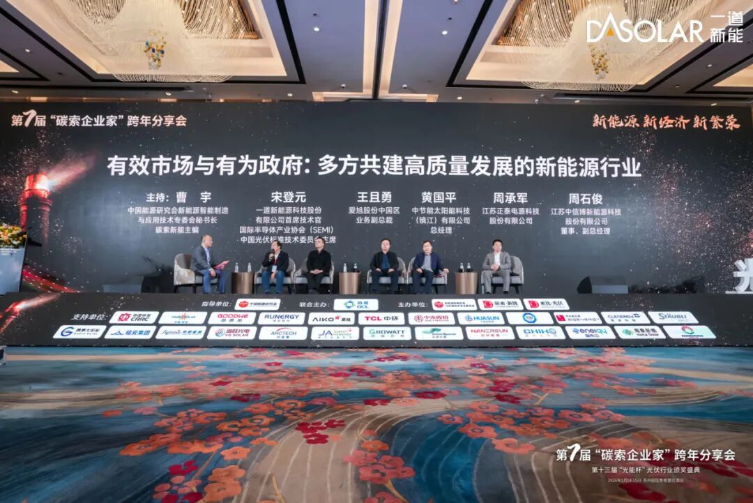 1月14-15日,第七届“碳索”企业家跨年分享会暨2025年第十三届“光能杯”光伏行业颁奖盛典在苏州召开。本次会议以“新能源·新经济·新繁荣”为核心议题,汇聚了光伏行业资深企业家、技术专家、行业组织、金融机构、高等院校专家学者等,共同探讨技术与市场方向,凝聚行业生态未来战略共识。一道新能CTO宋登元博士受邀出席并参加“多方共建高质量发展的新能源行业”主题高峰对话,系统阐述了通过有序竞争、创新驱动、生态平衡实现光伏的可持续发展破局之道。在同期举行的“光能杯”颁奖典礼上,凭借技术领先性与卓越的市场表现,一道新能获颁“2025年度最具影响力光伏组件企业”、“2025年度最具影响力场景化项目”两项大奖。