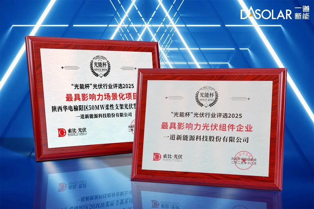 大会颁奖典礼环节上,一道新能凭借强劲的综合实力脱颖而出,斩获“2025 年度最具影响力光伏组件企业”奖项,陕西华电榆阳区50MW柔性支架光伏发电项目获颁“2025年度最具影响力场景化项目”。这双重认可既是对公司技术硬实力的高度肯定,更是市场口碑与行业地位的有力背书。依托在N型TOPCon、DBC、钙钛矿等核心技术领域的持续突破,叠加严苛的产品质量管控体系与全场景适配解决方案,一道新能已稳居一线光伏品牌阵营,成为新能源市场的中坚力量。公司场景化项目案例覆盖沙漠、城市、水面等多元领域,为不同应用场景提供定制化绿色能源解决方案,赢得了市场的广泛赞誉。面向未来,一道新能将持续加码研发投入,深化产学研协同创新机制,联合产业链上下游伙伴共建技术共享、互利共赢的产业生态,以技术迭代推动效率提升与成本优化,以场景创新拓展光伏应用边界,全力助推光伏产业向更高效率、更低成本、更优价值的高质量发展方向迈进,在全球碳中和的时代浪潮中,持续书写中国光伏企业的创新答卷与责任担当。