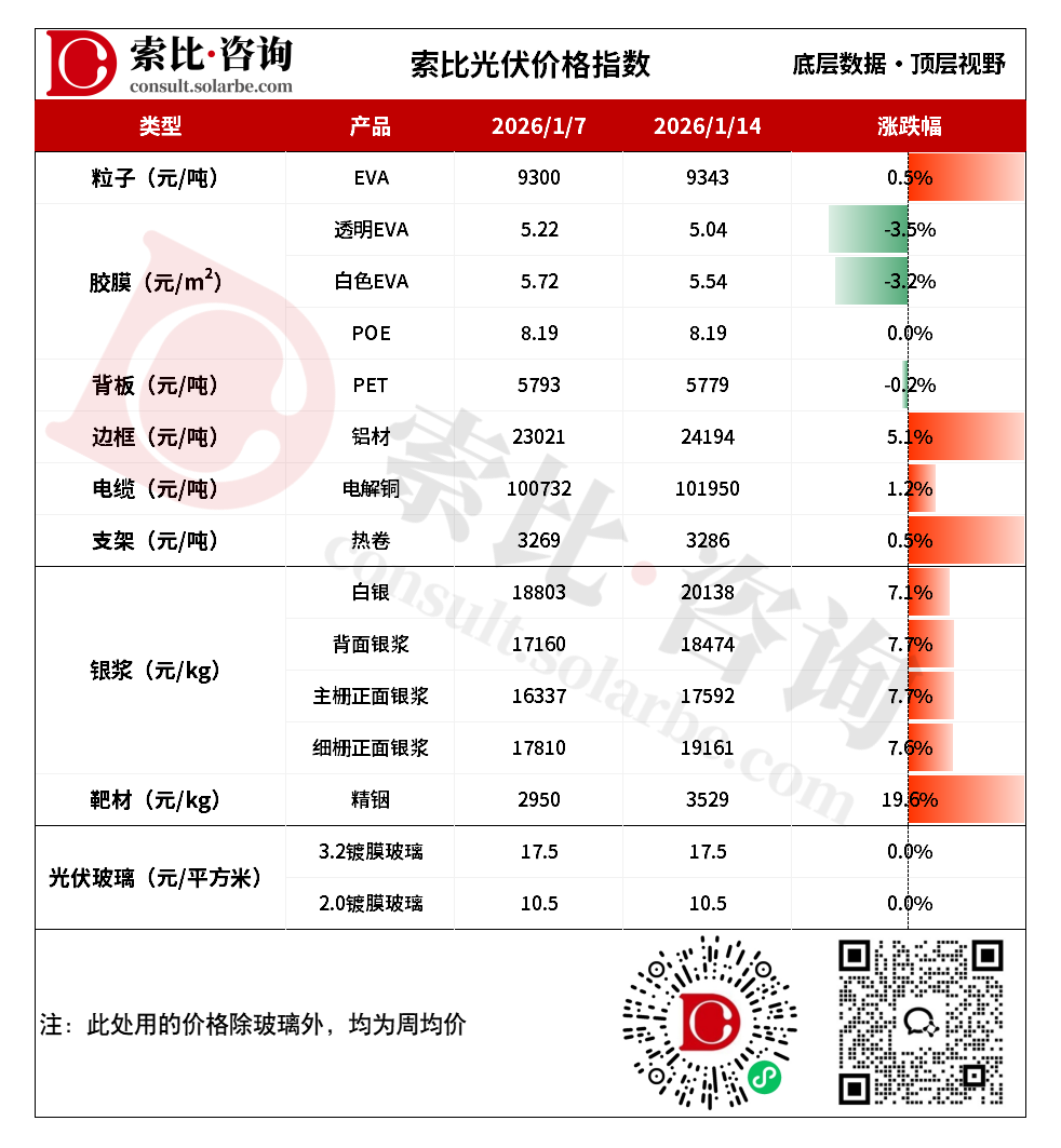 1、数据均为索比咨询整理,价格为均价,有疑问请联系我们,欢迎探讨