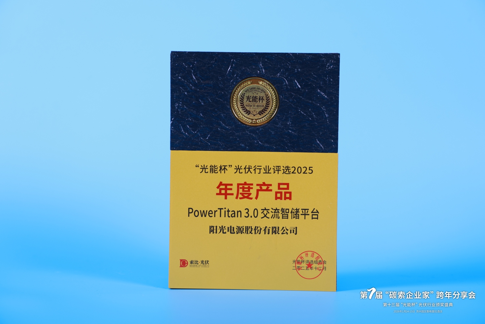 2026年1月15日,第七届"碳索企业家"跨年分享会暨2025年第十三届"光能杯"光伏行业颁奖盛典在苏州盛大举办。阳光电源股份有限公司凭借“PowerTitan 3.0 交流智储平台”产品,荣获2025年度“光能杯”年度产品大奖。