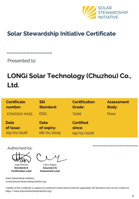 隆基绿能副总裁佘海峰表示:“获得SSI-ESG金牌认证,是对我们可持续发展实践的国际认可,也彰显了我们对欧洲客户核心价值的承诺——即提供可信赖的绿色产品。我们将持续以技术创新驱动,为欧洲客户提供高效、低碳足迹的光伏解决方案,助力降低能源转型成本、提升能源自主性,并携手加速碳中和进程,共同迈向可持续未来。”