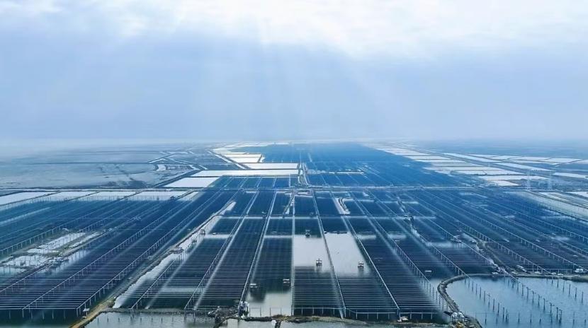 ▲连云港横店东磁940MW渔光互补项目,采用深圳安泰科索网柔性支架