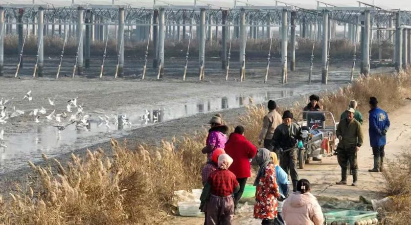 ▲渔民在岸边等待鱼获