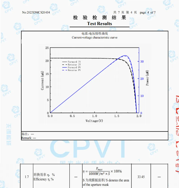 由琏升科技研发的钙钛矿/晶硅异质结叠层电池再次实现里程碑式效率跃升——经国家太阳能光伏产品质量检验检测中心(CPVT)权威认证,转换效率从32.99% 提升至33.45%。这一效率突破的核心在于琏升科技对HJT底电池的深度重构和钙钛矿顶电池界面工程的升级。