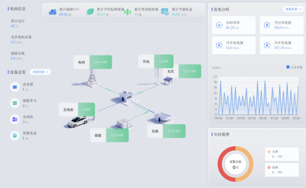 全景监测与能效分析:实时监测各电站发电/用电曲线,自动计算自发自用率、绿电占比等核心指标。