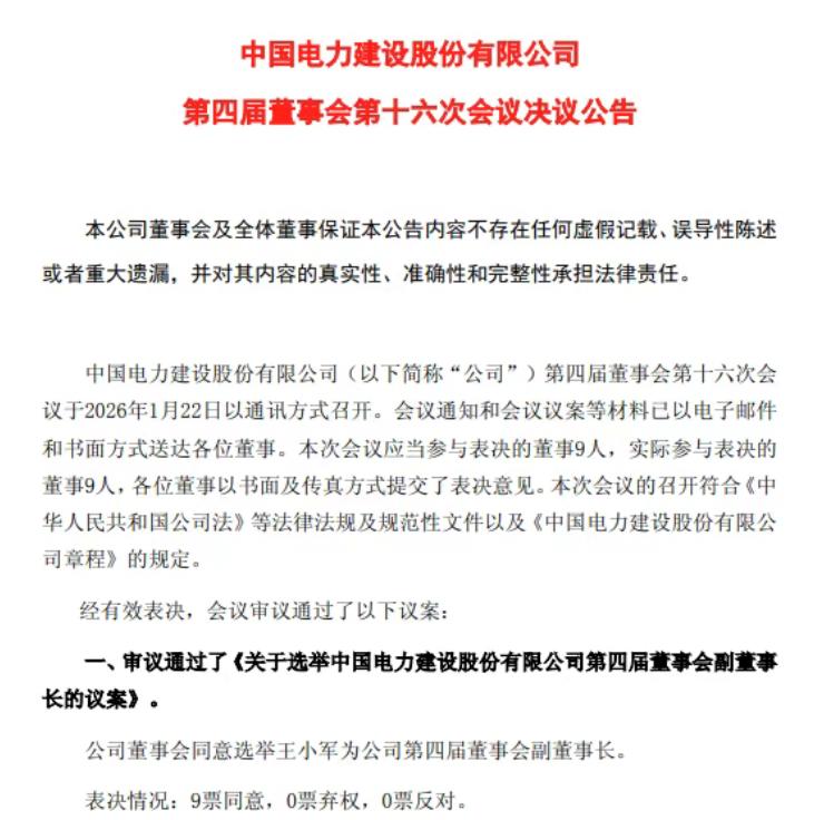 公告披露,中国电建于2026年1月22日召开第四届董事会第十六次会议。经有效表决,会议审议通过了《关于选举中国电力建设股份有限公司第四届董事会副董事长的议案》,公司董事会同意选举王小军为公司第四届董事会副董事长。