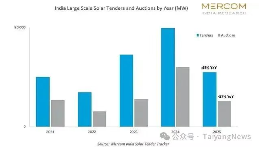Mercom指出,印度太阳能招标和拍卖活动在 2025 年显著下降。(图片来源:Mercom India Research)