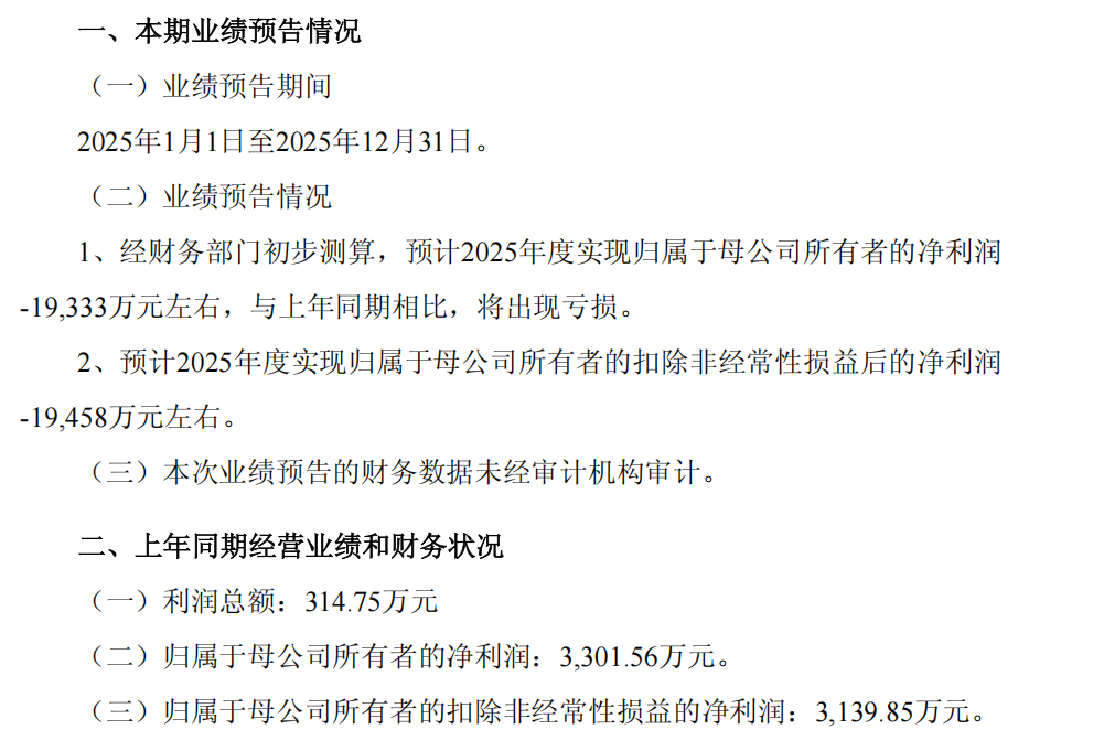 2026年1月24日,百达精工(603331)发布2025年年度业绩预告。预告称,浙江百达精工股份有限公司预计2025年年度实现归属于母公司所有者的净利润-19,333万元左右。预计公司2025年年度实现归属于母公司所有者的扣除非经常性损益的净利润-19,458万元左右。本次业绩预告的财务数据未经审计机构审计,敬请广大投资者注意投资风险。