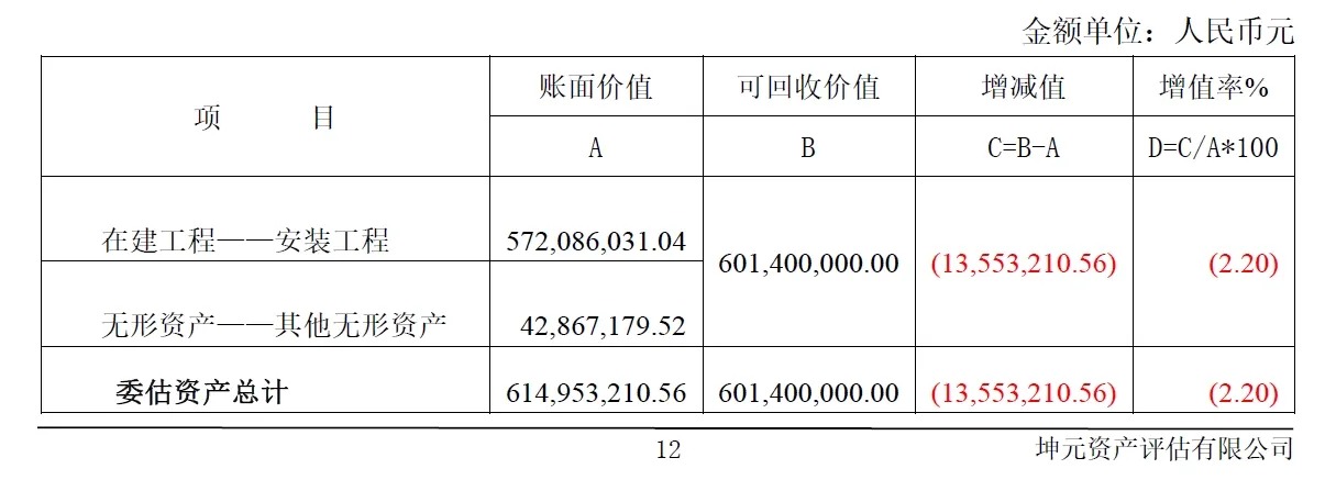 在本报告所揭示的评估假设基础上,委估资产组可回收价值为601,400,000.00元(大写为人民币陆亿零壹佰肆拾万圆整),与账面价值614,953,210.56元相比,评估减值13,553,210.56元,减值率为2.20%。资产评估结果汇总如下表: