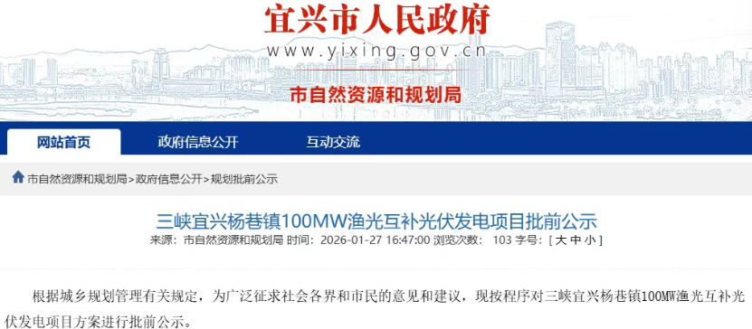 1月27日,江苏省宜兴市自然资源和规划局发布“三峡宜兴杨巷镇100MW渔光互补光伏发电项目批前公示”。