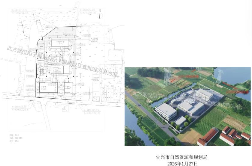 公示内容显示,该项目位于宜兴市杨巷镇城典村,用地面积为7333平方米,用地性质为供电用地,建筑总面积约2264平方米,建设单位为三峡宜兴新能源有限公司。