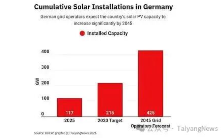 德国政府设定的光伏装机容量目标是从 2025 年底的 117GW提升到 2030 年的 215GW。该国电网运营商预计到 2045 年将达到 425GW。(图片来源:TaiyangNews)