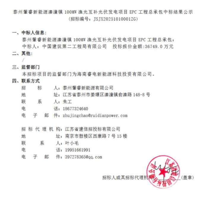 近日,泰州肇睿新能源溱潼镇100MW渔光互补光伏发电项目EPC工程总承包中标结果公示。