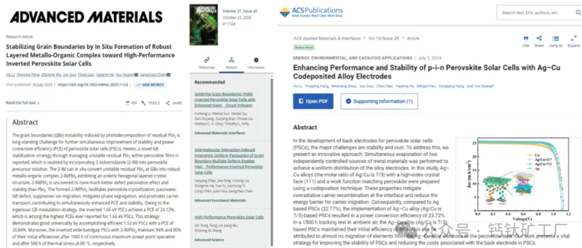 在成本控制与规模化制备方面,团队以电极创新实现性能与经济性的平衡,通过共蒸镀Ag-Cu合金电极有效解决Ag电极与电子传输层的能级错配并抑制离子迁移,使1.56 eV器件效率达到23.72%,同时显著降低电极材料成本;面向大面积制造,团队初步尝试刷涂铜浆电极的低温、低成本路线,工艺简单、易于规模化,为后续迭代优化奠定基础。