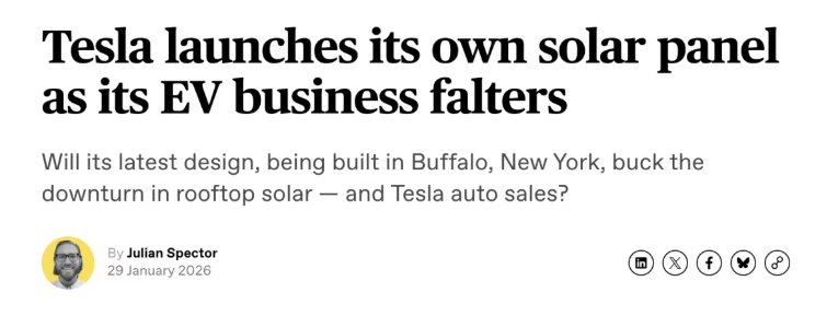 据Canary Media报道:2025年特斯拉电动汽车业务营收、交付量双双下滑,却在能源板块甩出了全新王牌,正式推出首款完全自主设计和制造的屋顶太阳能光伏面板。
