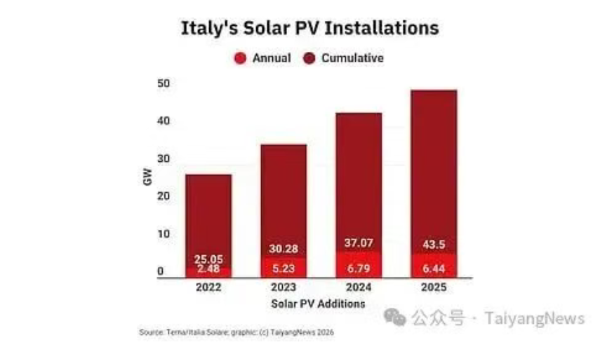 2025年意大利新增光伏装机6.4GW,累计容量达到 43.5GW。(制图:TaiyangNews)